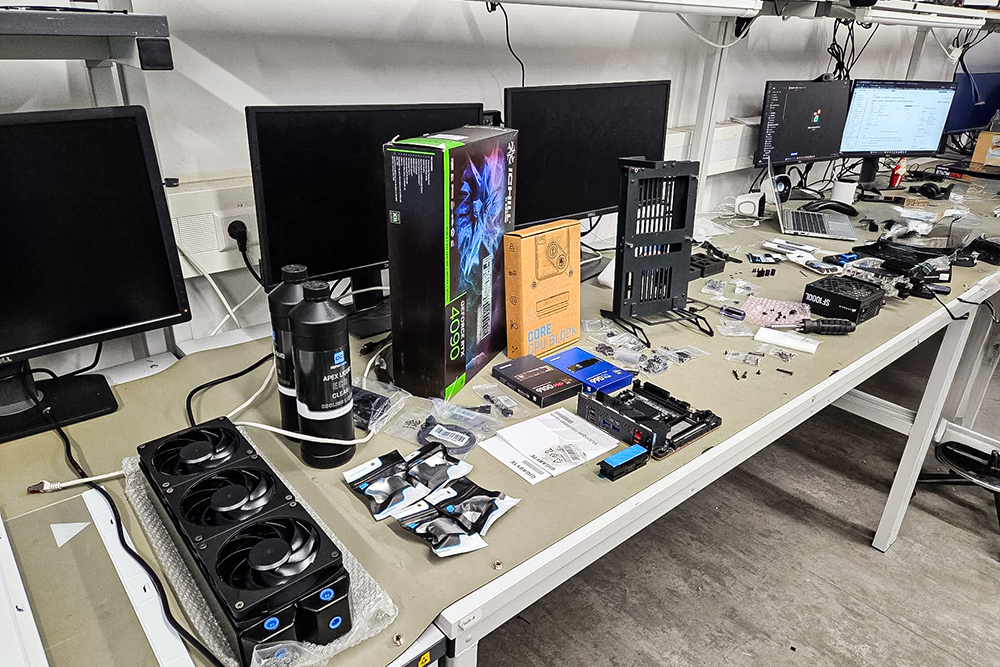 In unserer eigenen Fertigung und im Rahmen unseres Assembly Programms bauen wir komplette Systeme – Gaming-PCs, Workstations, Industrie-PCs und sogar komplexe AI-Server inklusive Wasserkühlung.