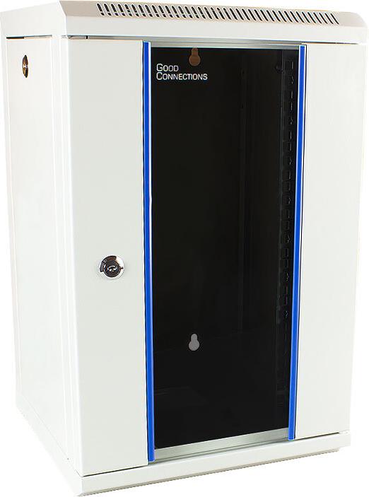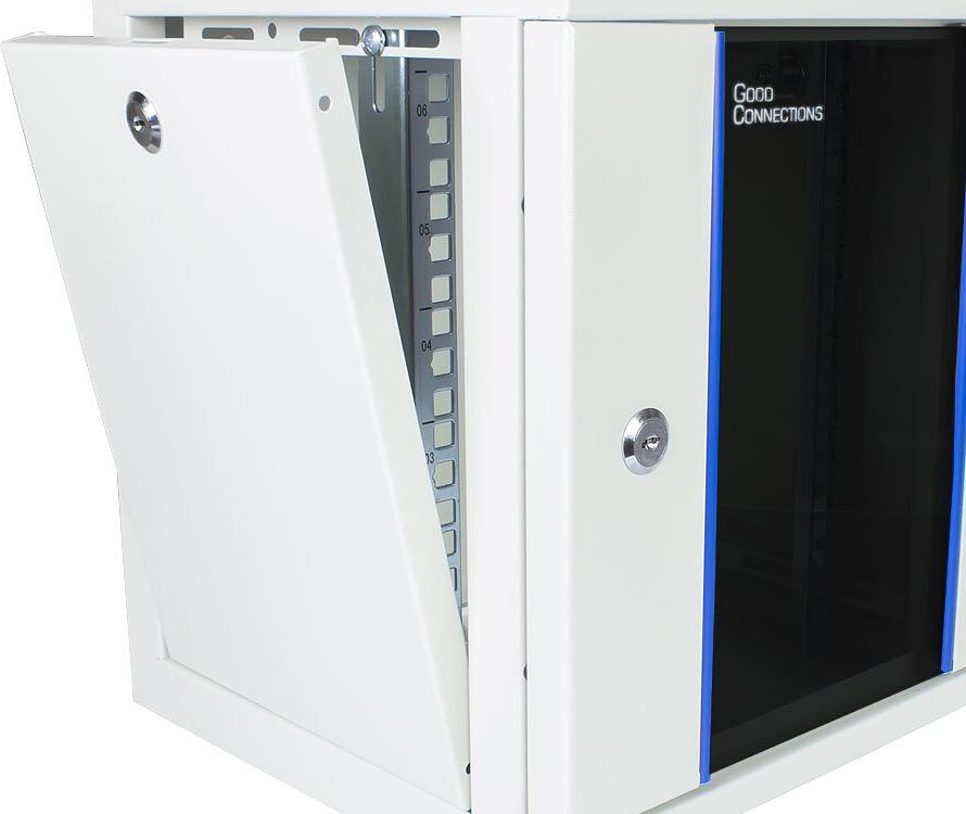 Das 10\" Netzwerk-Wandgehäuse von Good Connections eignet sich dank schneller Montage und stabiler Stahlkonstruktion ideal für alle gängigen Anwendungen im EDV- und Telekommunikationsbereich. Durch die geringe Tiefe von 300 mm wird eine platzsparende Installation ermöglicht. Das bereits vormontiert gelieferte Wandgehäuse besteht aus einem Zentralteil mit einer abschließbaren Sichttür und zwei abschließbaren Seitenteilen. Einen optimalen Zugang hinter die eingebauten Komponenten erhält man durch die abnehmbaren Seitenwände.