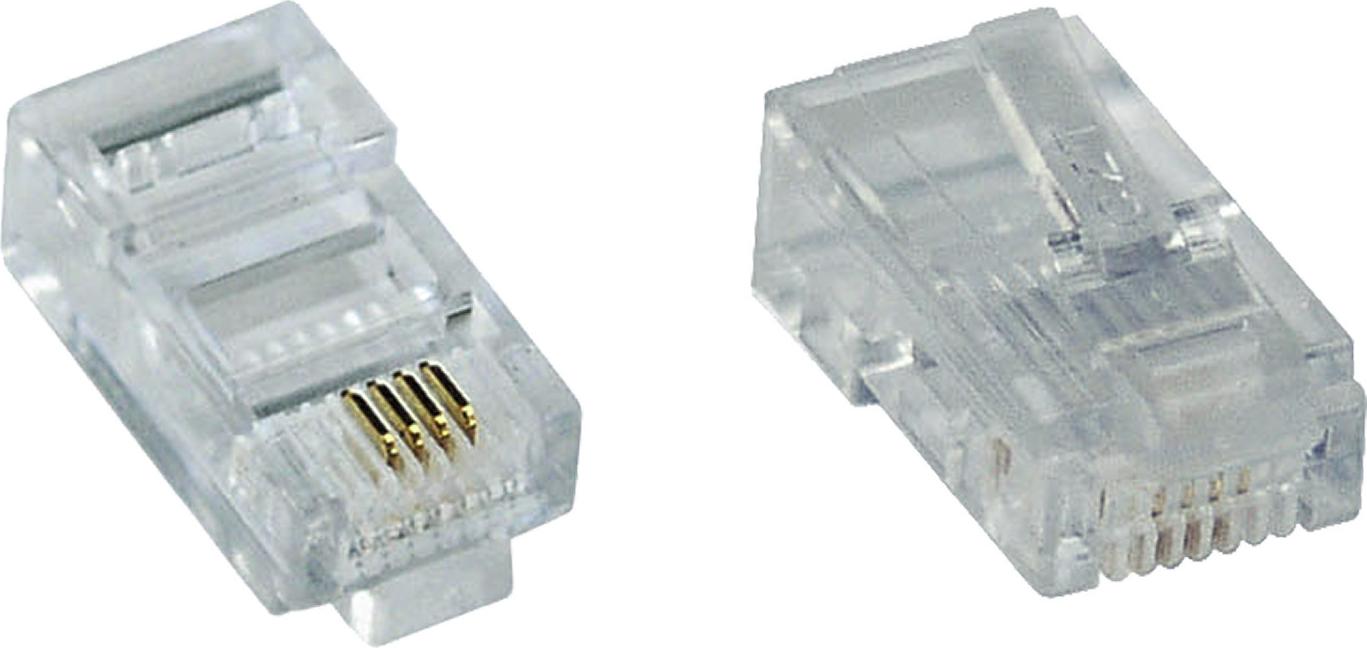 Dieser Modularstecker hat die Bauform von einem RJ45 Stecker, wobei nur die inneren 4 Pins belegt sind. Die Kontakte 3, 4, 5 und 6 werden für den S0 Bus bei ISDN Installationen benötigt.• RJ45 Stecker mit 4 Kontakten