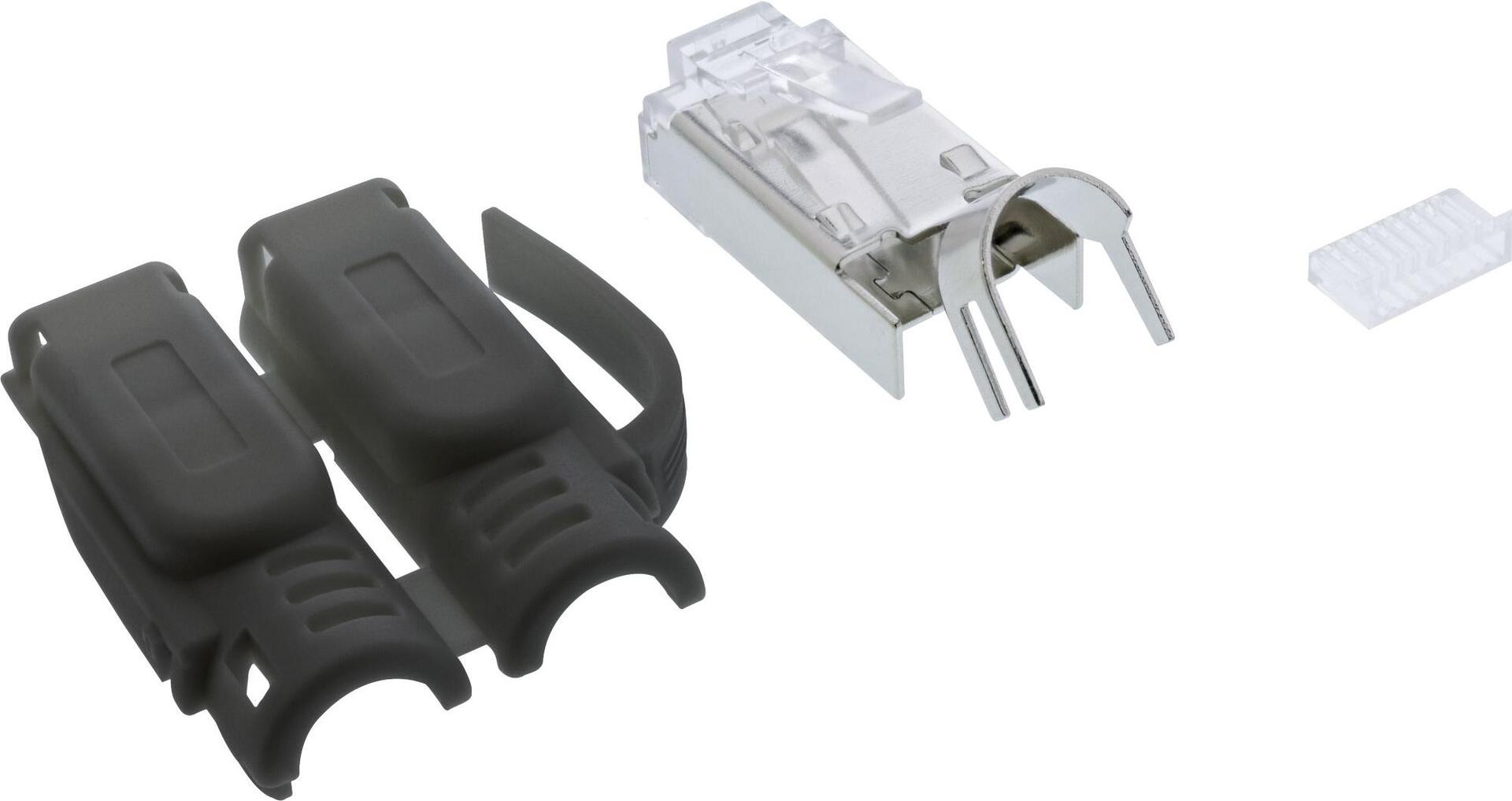 • 3-teiliger Stecker, bestehend aus RJ-45 Hauptstecker, Einfädelhilfe, Knickschutztülle