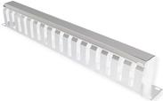 19" Frontplatte mit einer Höheneinheit (1HE) und 40x60mm Kabelkanal, lackiert in grau • Kanal für Kabelführung von Rangierkabeln • Ermöglicht Kabelführung im inneren Schrankbereich durch ovale Öffnungen in der Kabelführungsplatte • Farbe: pulverbeschichtet grau, Rangierkanal grau.