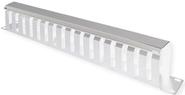 19" Fronplatte mit einer Höheneinheit (1HE) und 40x80mm Kabelkanal, lackiert in RAL 7035 (lichtgrau) • Kanal für Kabelführung von Rangierkabeln • Ermöglicht Kabelführung im inneren Schrankbereich durch ovale Öffnungen in der Kabelführungsplatte • Farbe: pulverbeschichtet grau, Rangierkanal grau.