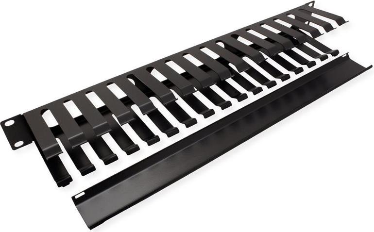 19" Frontplatte mit einer Höheneinheit (1HE) und 40x80mm Kabelkanal, lackiert in schwarz • Kanal für Kabelführung von Rangierkabeln • Ermöglicht Kabelführung im inneren Schrankbereich durch ovale Öffnungen in der Kabelführungsplatte • Farbe: pulverbeschichtet schwarz, Rangierkanal schwarz.