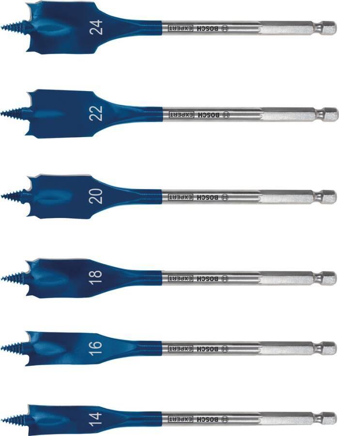 EXPERT SelfCut Speed Flachfräsbohrer-Set, 14/16/18/20/22/24 mm, 6-tlg.Bis zu 3-mal schneller als ein StandardbohrerSchnelles Bohren ist mit der Bosch Tip Technology einfachSechskantschaft für maximale Kraftübertragung in Standard-Bohrfutte