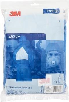 Schutzanzug 4532+ Typ 5/6Der 3M™ Schutzanzug 4532+ hilft dabei sich vor gesundheitsgefährdenden Stäuben (Typ 5) und Flüssigkeitsspritzern (Typ 6) zu schützen.Ausstattung: Schutz vor Stäuben und bestimmten Flüssigkeitsspritzern (CE Typ 5/6)Das Material ist speziell ausgerüstet, um Flüssigkeitsspritzer, die auf Alkohol, Öl oder Lösemittel basieren, besser abzuweisenLeichtes Material (SSMMS) mit hoher AtmungsaktivitätAntistatisch ausgerüstetes GewebeElastische Einsätze an Hüfte und Knöchel für ein angenehmes Tragegefühl und verbesserte BewegungsfreiheitZwei-Wegereißverschluss mit abgeklebter Patte für einfache Handhabung und verbesserten SchutzFusselarmVerstärkte Schnittführung im SchrittDreiteilige Kapuze für eine verbesserte Passform und Kompatibilität zu weiterer PSA.Technische Daten: Farbe: BlauGröße: M