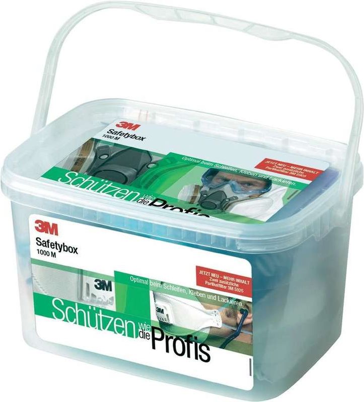 3M Safety Box inkl. wichtigen Arbeitsschutzprodukten -------------- für den Markt: D / L / A / CH --------------- Inhalt: 1 x Halbmaske 6200, 1 x Partikelmaske 9322, 1 x Bügelgehörschutz 1310, 1 Paar Gehörstöpsel 1100, 1 Vollsicht-Schutzbrille und 1 Infobroschüre Arbeitsschutz (1000M)