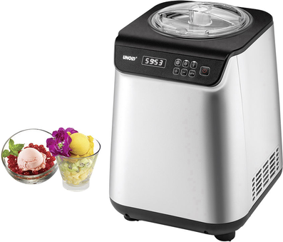Mit der Eismaschine Uno ist der Do-it-yourself-Eisgenuss ein Kinderspiel. Sind die Zutaten vorgekühlt, lassen sich in nur 30 Minuten 1,2 Liter köstliche Sahneeiscreme zubereiten. Aber auch für vegane, laktosefreie und steviahaltige Rezepturen ist das kompakte Gerät ideal. So lassen sich beste Zutaten nach persönlichem Geschmack verarbeiten!Im ebenso eleganten wie robusten Gehäuse befindet sich der vollautomatische, selbstkühlende Kompressor, der für eine kontinuierliche Kälteerzeugung sorgt. Der Motor ist sogar für den Dauerbetrieb in der hauseigenen Eisdiele geeignet.Bis zu circa -35 °C reicht der Gefrierbereich der Eismaschine Uno, die über einfach zu bedienende Tasten aktiviert wird. Das LCD-Display informiert über die Restlaufzeit und bietet auch die praktische Timer-Funktion: von 5 bis 60 Minuten einstellbar, wird das Eis zum gewünschten Zeitpunkt fertiggestellt und kann dann genussvoll weggeschleckt werden. Rezept-Inspirationen gibt es in der Bedienungsanleitung gleich mit!Durch die Deckelöffnung können weitere Zutaten zugegeben werden - Nüsse, Krokant, Fruchtstücke... Für die bequeme Reinigung sorgt der entnehmbare, eloxierte Eisbehälter.