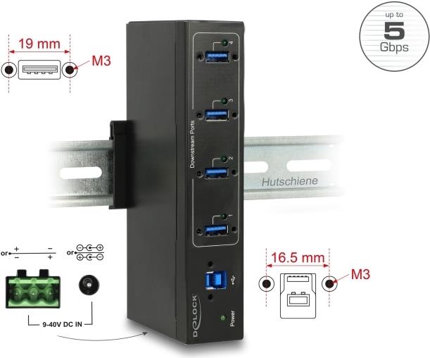 DeLock External Industry Hub 4 x USB 3.0 Type-A with 15 kV ESD protection - Hub - 4 x SuperSpeed USB 3.0 - wandmontierbar - Gleichstrom