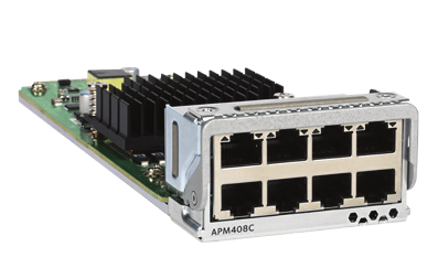 Die APM408C Port-Karte bietet 8 100M/1G/2,5G/5G/10GBASE-T-Ports. Verwenden Sie für einen Kupfer-Port mit 10 GBit/s ein Kabel der Kategorie 6 oder besser (Kategorie 6, 6a oder 7).