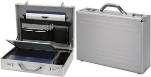 Glattes Aluminium, zwei Zahlenkombinationsschlösser. Innen: Herausnehmbare Laptop-Polsterung,