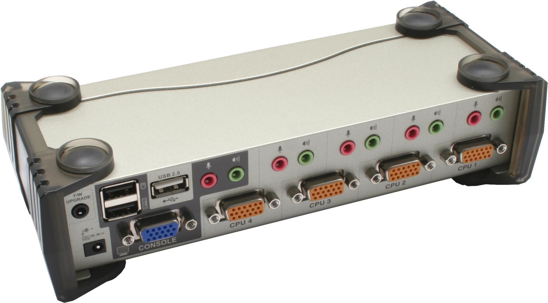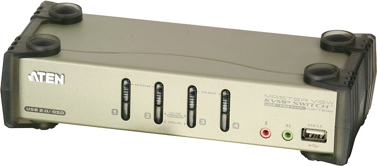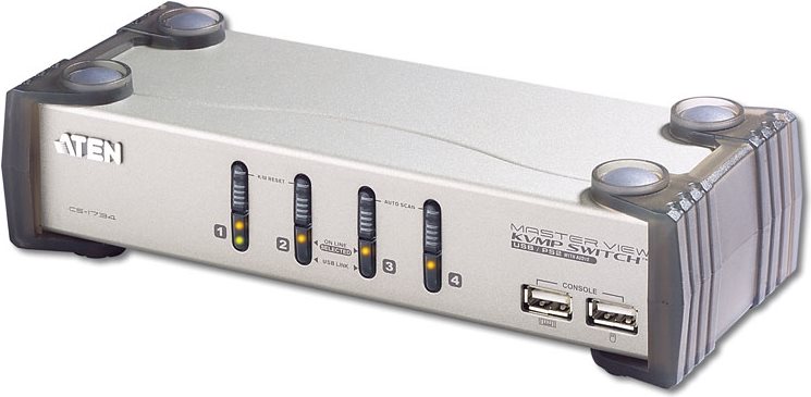 Der CS1734 kombiniert einen 4-Port-KVM-Switch mit einem 2-Port-USB 2.0-Hub. Als KVM-Switch ermöglicht er es, vier Computer von einer einzigen Konsole (Tastatur, Monitor und Maus) aus zu steuern. Das Gerät bietet drei verschiedene Möglichkeiten, die Konsole umgehend auf einen anderen Computer zu legen: Manuell, über Hotkey-Tastenkombinationen, über das OSD-Menund per Mausklick.