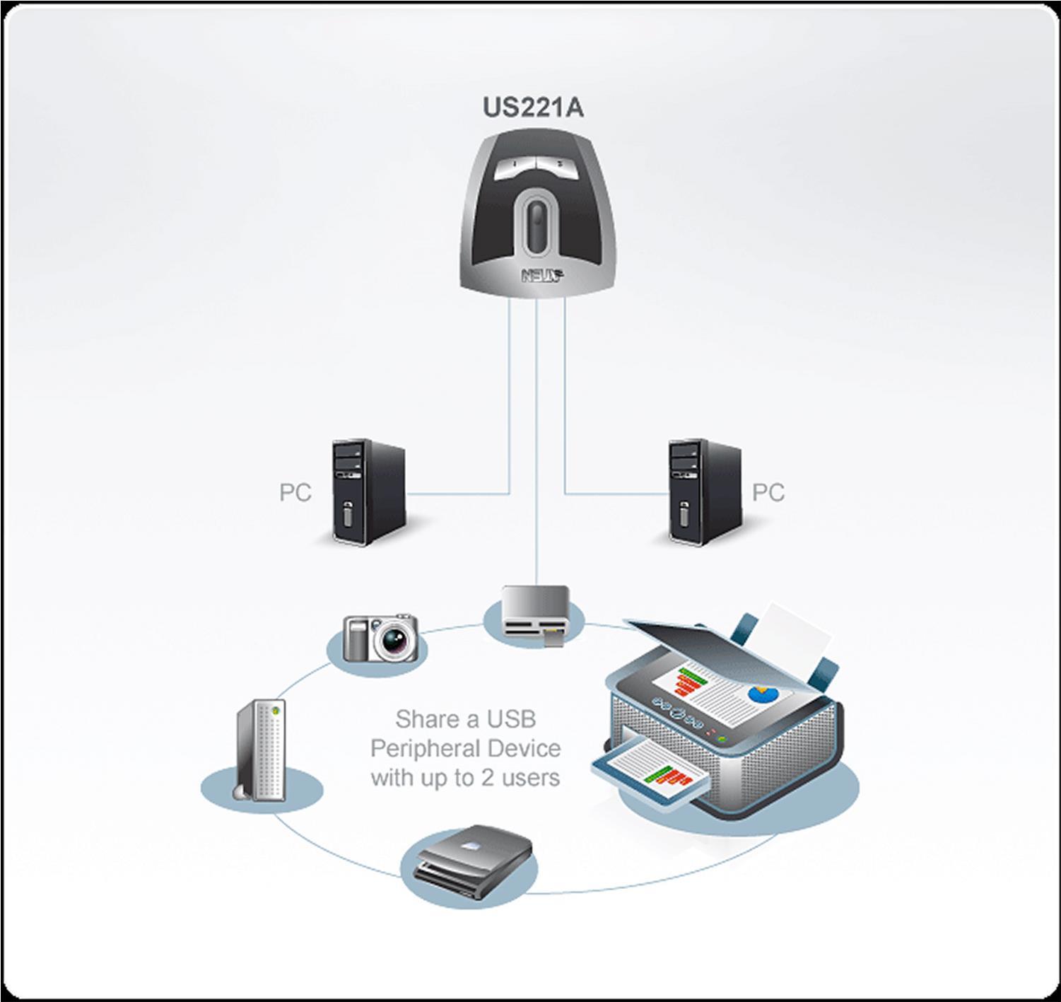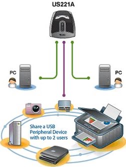 Der US221A ist ein Peripheriegeräte-Switch mit 2 USB 2.0-Ports, mit dem 2 Computer gemeinsamen, zeitversetzten Zugriff auf ein einziges USB-Peripheriegerät (z.B. einen Drucker, Scanner, Massenspeichergerät usw.) erhalten.