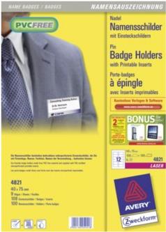 AVERY Namensschild mit Wellennadel, 75 x 40 mm transparent, aus PVC-freiem Material, Befestigung mit - 1 Stück (4821.FR)