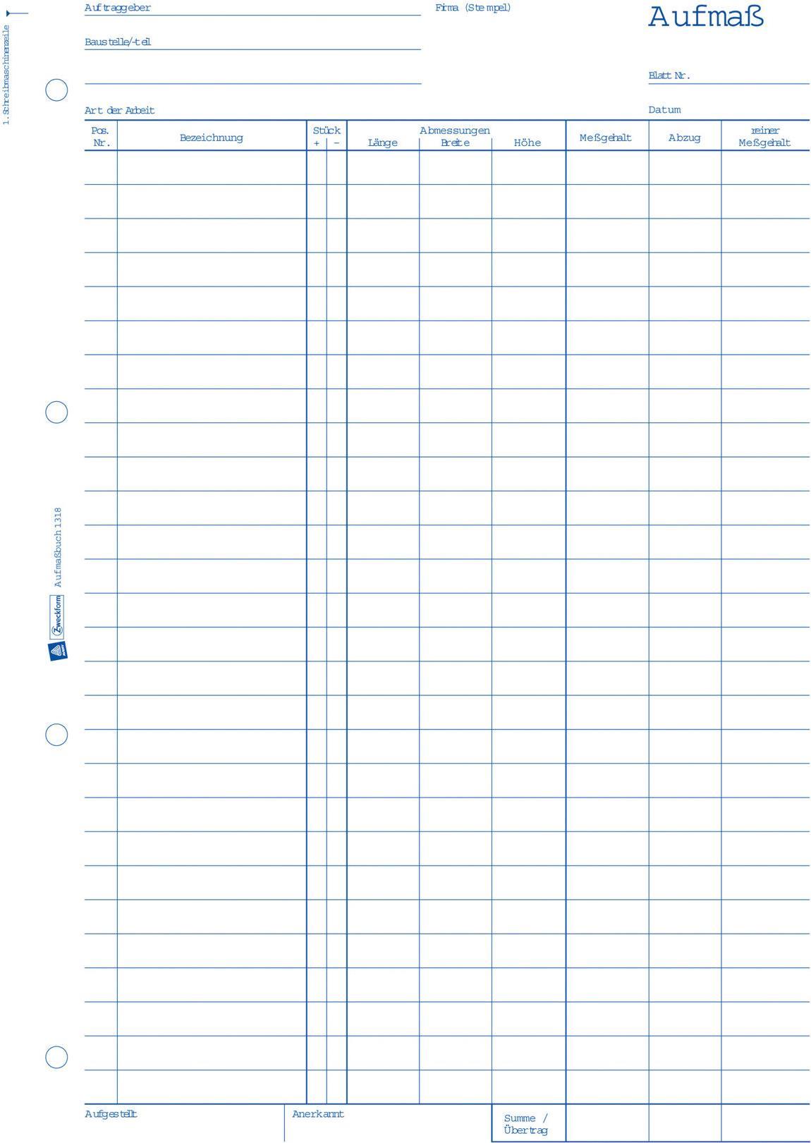 Die Bauformulare von Avery Zweckform sind unverzichtbare Helfer für Bau und Handwerk. Das Aufmaßbuch eignet sich besonders, um den Materialverbrauch zu dokumentieren. Das Aufmaßbuch im DIN A4 Format beinhaltet 2 Blatt Blaupapier. Die Bauformulare von Avery Zweckform sind vorgelocht, für eine schnelle Ablage!