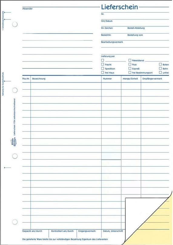 Die Lieferscheine von Avery Zweckform helfen Ihnen dabei zu dokumentieren welche Produkte bzw. Waren Sie geliefert oder empfangen haben. Die Liefer-/ Versandart ist bereits auf dem selbstdurchschreibenden Lieferschein im DIN A4 Format vorgegeben und kann angekreuzt werden.