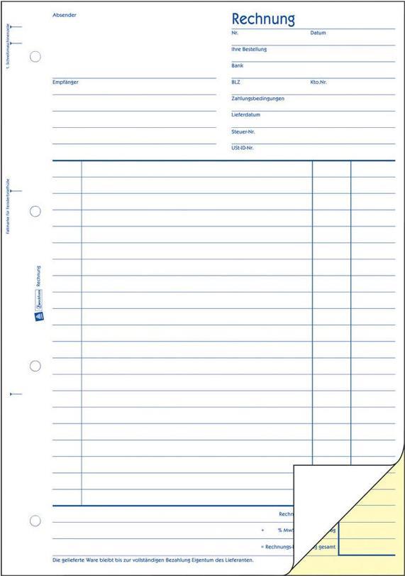 Die Rechnungen von Avery Zweckform enthalten alle wichtigen Angaben wie Steuernummer, Umsatzsteuer Identifikationsnummer, Bankverbindung sowie Angaben zu Artikeln und Preisen. Damit stellen Sie die steuerliche Anerkennung sicher. Die Rechnung im DIN A4 Format ist selbstdurchschreibend und besteht aus zwei Durchschlägen.