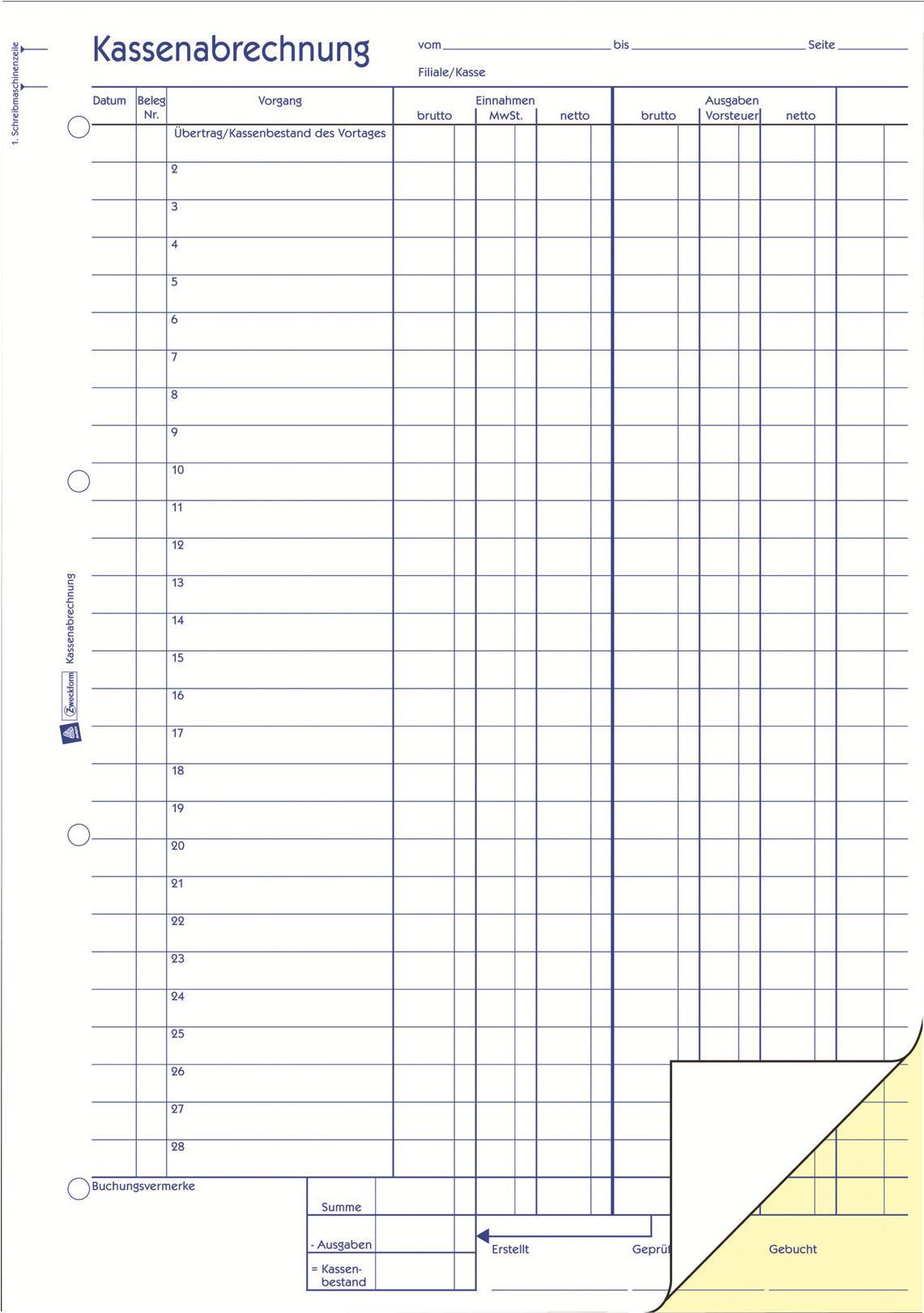 Bewahren Sie den Überblick über Ihre Einnahmen und Ausgaben. Mit der selbstdurchschreibenden Kassenabrechnung von Avery Zweckform gelingt Ihnen das problemlos. Die Kassenabrechnung bietet Ihnen eine praxisorientierte Einteilung sowie die Möglichkeit der Einzelerfassung von Brutto-, Netto- und Steuerbeträgen bei Einnahmen und Ausgaben.Die Kassenformulare von Avery Zweckform werden regelmäßig von Rechtsexperten überprüft und aktualisiert.