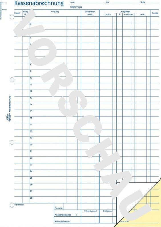 Bewahren Sie den Überblick über Ihre Ausgaben. Mit der selbstdurchschreibenden Kassenabrechnung von Avery Zweckform gelingt Ihnen das problemlos. Alle Vorgänge werden penibel einzeln erfasst, Belegen zugeordnet und ausgabenseitig als Brutto- und Nettobetrag unter Angabe der Vorsteuer (Prozentsatz, Betrag) dokumentiert. Die Kassenformulare von Avery Zweckform werden regelmäßig von Rechtsexperten überprüft und aktualisiert.