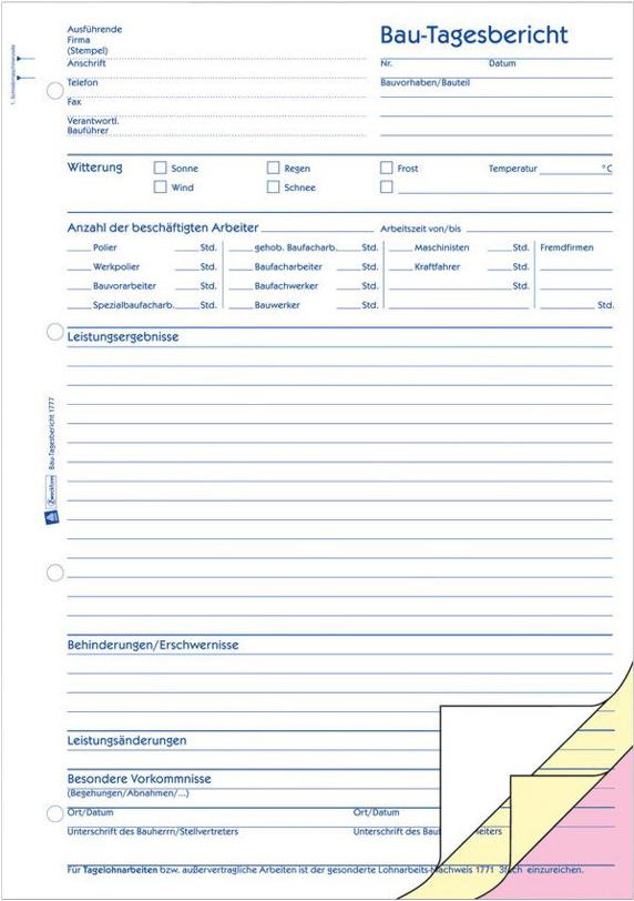 Die Bauformulare von Avery Zweckform sind unverzichtbare Helfer für Bau und Handwerk. Der Bautagesbericht ist behördlich vorgeschrieben! Der Bau-Tagesbericht enthält eine klare Untergliederung in Witterung, beschäftigte Arbeiter, Fremdfirmen, Behinderungen, Änderungen und besondere Vorkommnisse. Die Bauformulare von Avery Zweckform sind vorgelocht, für eine schnelle Ablage!