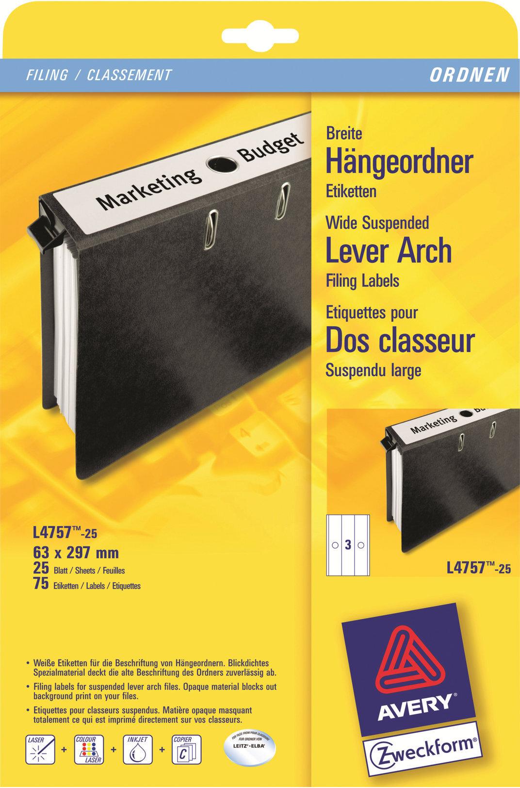Schaffen Sie Ordnung in Ihrer Ablage. Mit den Rückenschildern für Hängeordner von Avery Zweckform stellen Sie sicher, dass Ihre Unterlagen professionell beschriftet sind. So finden Sie auf Anhieb den richtigen Hängeordner. Die Hängeordner-Etiketten im Format 63 x 297 mm lassen sich mit allen gängigen Druckern und Kopierern bedrucken. Dank der kostenlosen Avery Zweckform Vorlagen und Software-Lösungen können Sie Ihre Hängeordner schnell und einfach gestalten und bedrucken!