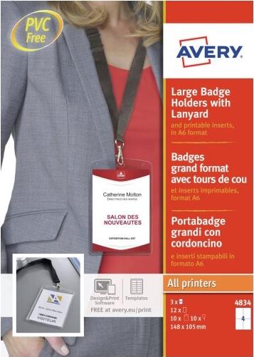 Die Namensschilder Taschen 4834 von AVERY ZWECKFORM im Format 148 x 105 mm (DIN A6) erleichtern Ihnen die Organisation von Veranstaltungen, Seminaren und Konferenzen. Das Namensschilder-Set beinhaltet 12 mikroperforierte Einsteckschilder, 10 PVC-freie transparente Taschen und 10 Textilbänder. Die Namensschilder Taschen werden an einem Textilband befestigt. Die Namensetiketten bieten einen garantiert staufreien Druckerdurchlauf auf allen gängigen Inkjet- und Laserdruckern.