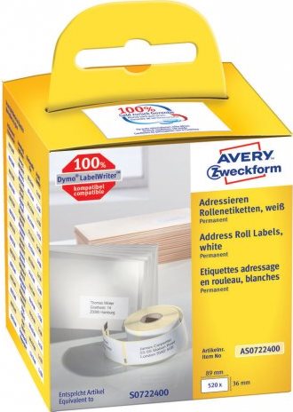 Sie brauchen eine Etikettenrolle für Ihren Dymo Labelwriter oder Seiko Smart Label Printer? Die Adress-Rollenetiketten AS0722400 von Avery Zweckform entsprechen dem Dymo Artikel S0722400 und sind 100% kompatibel mit dem Dymo Labelwriter LW310, LW330T, LW400 Serie, LW450 Serie, 4XL und dem Seiko Smart Label Printer (SLP-2RLE)! Die lang bewährte Etiketten Qualität kommt zudem zu einem sehr attraktiven Preis.