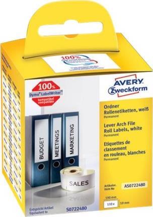 Die weißen, permanent haftenden Rollenetiketten AS0722480 im Format 59x190mm von AVERY ZWECKFORM eignen sichbesonders zum Beschriften von Ordnern. Die Ordneretiketten sind 100% kompatibel mit dem Dymo Labelwriter LW330T, LW400 Serie, LW450 Serie. Diese Thermoetiketten entsprechen dem Dymo Artikel S0722480. 110 Etiketten auf Rolle pro Packung. Die Rollenetiketten zeichnen sich durch eine überdurchschnittlich gute Klebkraft aus (gemessen nach FTM2 und FTM9 auf allen gängigen Oberflächen). Sie sind FSC zertifiziert und frei von Bisphenol A (BPA).