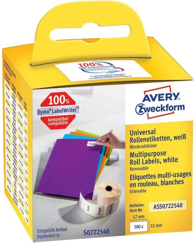 Die weißen, wiederablösbaren Universal Rollenetiketten ASS0722540 im Format 32x57mm von AVERY ZWECKFORM bieten Ihnen für jeden Bedarf das passende Etikett. Die Aufkleber sind 100% kompatibel mit dem Dymo® Labelwriter™ LW330T, LW400 Serie, LW450 Serie, 4XL und LW Wireless. Diese Thermoetiketten entsprechen dem Dymo® Artikel S0722540. Kleine Packungsgröße: 500 Etiketten auf Rolle pro Packung. Die Rollenetiketten zeichnen sich durch eine überdurchschnittlich gute Klebkraft aus (gemessen nach FTM2 und FTM9 auf allen gängigen Oberflächen) und sie sind frei von Bisphenol A (BPA). Gestalten und drucken Sie je nach Bedarf einzelne oder auch mehrere Aufkleber schnell und einfach selbst mit Ihrer Dymo® Software.