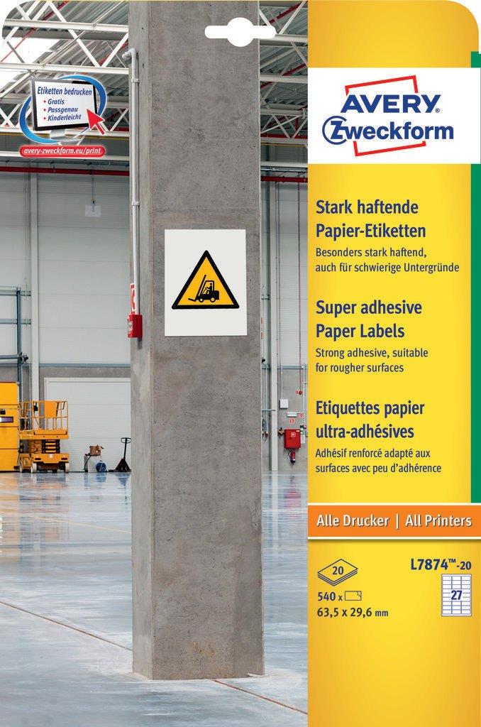 Avery Zweckform - Papier - permanenter Klebstoff - weiß - 63,5 x 29,6 mm 540 Etikett(en) (20 Bogen x 27) Etiketten (L7874-20)