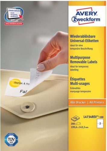 Avery L4734REV-100 - Weiß - Abgerundetes Rechteck - 199.6 x 143.5 mm - A4 - Papier - Universal (L4734REV-100)