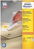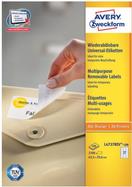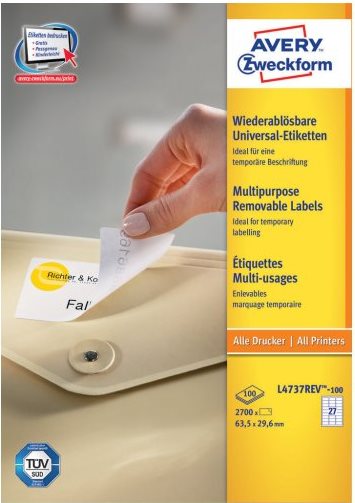 Die weißen wiederablösbaren Universal-Etiketten L4737REV-100 im Format 63,5x29,6mm von AVERY ZWECKFORM eignen sich z.B. für Firmenetiketten (2700Etiketten/Pck). Die Etiketten haften sicher auf den verschiedensten Oberflächen und sind wiederablösbar, ohne Klebstoffrückstände zu hinterlassen. Sie können sich auf einen absolut staufreien Druckerdurchlauf ohne Klebstoffablagerungen im Drucker verlassen. Druckerdurchlauf für Laserdrucker getestet und bestätigt durch den TÜV SÜD.