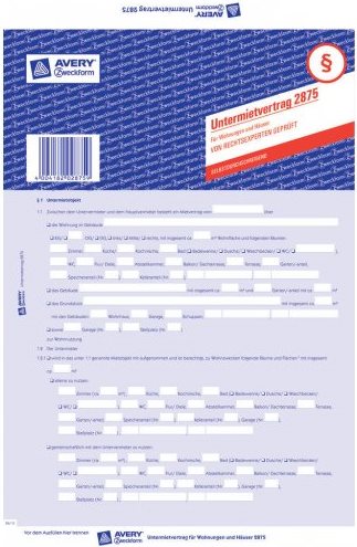 Egal ob Sie Mieter oder Vermieter sind, mit einem Mietvertrag von Avery Zweckform sind Sie auf der sicheren Seite. Der Untermietvertrag wurde von Rechtsexperten erstellt und wird regelmäßig an die Änderungen im Mietrecht angepasst. Der in Blau gehaltene Untermietvertrag regelt neben der Miete auch die Betriebkosten wie Heizung und Warmwasser, die anteilig zu tragen sind. Zudem enthält der 5-seitige Mietvertrag eine Vereinbarung zur Kaution und ist selbstdurchschreibend.