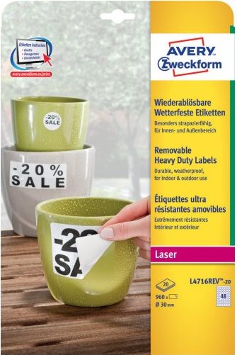 Perfekt für die flexible Handhabung im Aussenbereich: Die wiederablösbaren, wetterfesten Etiketten von Avery Zweckform überzeugen durch Ihre starke Haftung sogar draußen bei Wind und Wetter und sind wiederablösbar, ohne Kleberückstände zu hinterlassen. Die beschichteten, weißen Folienetiketten im runden Format Ø30mm eignen sich perfekt für Promotions, temporäre Produkt-und Eigentums-Kennzeichnung oder bei wechselnden Informationen im Lagerbereich. Denn sie sind öl- und schmutzbeständig, resistent gegen UV-Strahlung, temperaturbeständig (-20°C bis +80°C) und wasser- und reißfest.