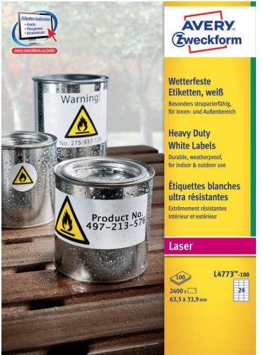 Wenn es mal etwas härter zugeht, wir haben die Lösung: Die wetterfesten Etiketten von Avery Zweckform. Die beschichteten, weißen Folienetiketten im Format 63,5x33,9mm sind deutlich strapazierfähiger als herkömmliche Papieretiketten. Durch Ihre starke Haftung eignen sie sich zur sicheren und dauerhaften Kennzeichnung sogar draußen bei Wind und Wetter wie z.B. bei Lagerhaltung im Außenbereich. Denn sie sind öl- und schmutzbeständig, resistent gegen UV-Strahlung, temperaturbeständig (-20°C bis +80°C) und wasser- und reißfest.