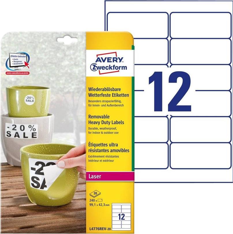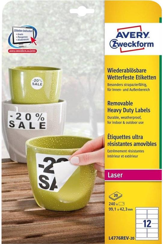 Avery Zweckform L4776REV - Selbstklebende, abnehmbare, matte Polyester-Folienetiketten für den Außenbereich - weiß - 99,1 x 42,3 mm 240 Etikett(en) (20 Bogen x 12) (L4776REV-20)