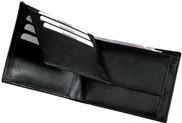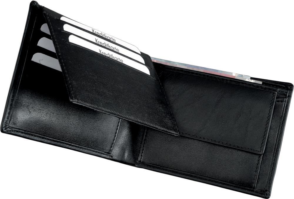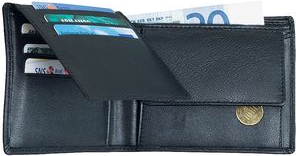 Querformat, Netzfach für Führerschein etc., acht Visiten-/Kreditkartenfächer, drei verdeckte Einschubfächer, ein großes Reißverschlussfach, Münzfach mit Ersatzschlüsselfach, zwei Scheinfächer, Verschlusslasche mit Druckknopf.