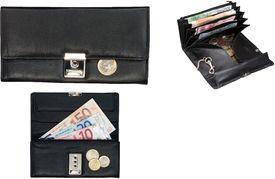 In dieser Die Kellnerbörse umfasst 6 Fächer, in denen Sie all Ihre Scheine sortieren können. Das Münzgeld findet seinen Platz entweder in einem offenen Klappfach oder in einem Reißverschlussfach. Die Börse ist mit einem dreistufigen Schloss an unterschiedliche Inhaltsmengen anpassbar.