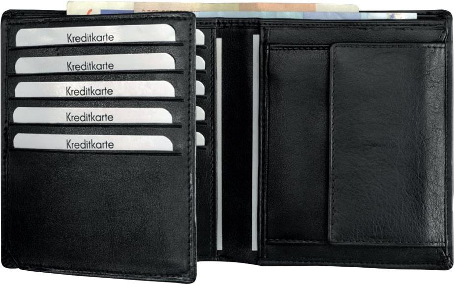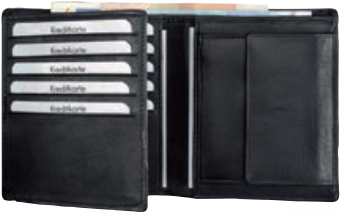 Hochformat, zehn Kreditkartenfächer, zwei Scheinfächer, Ausweisfach, Münzfach.