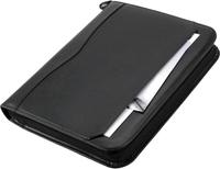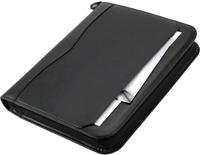 Komfortable Ringbuchmappe in A4 aus schwarzem FINEtouch-Lederimitat. Die vielseitig einsetzbare Ringbuchmappe verfügt über einen umlaufenden Reißverschluss, eine herausnehmbare Ringmechanik mit vier Klarsichthüllen und einen A4 Schreibblock.