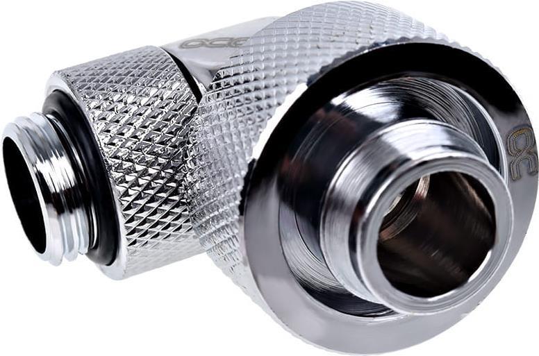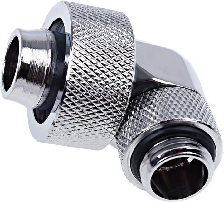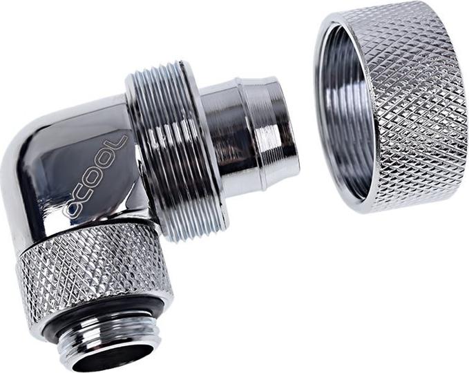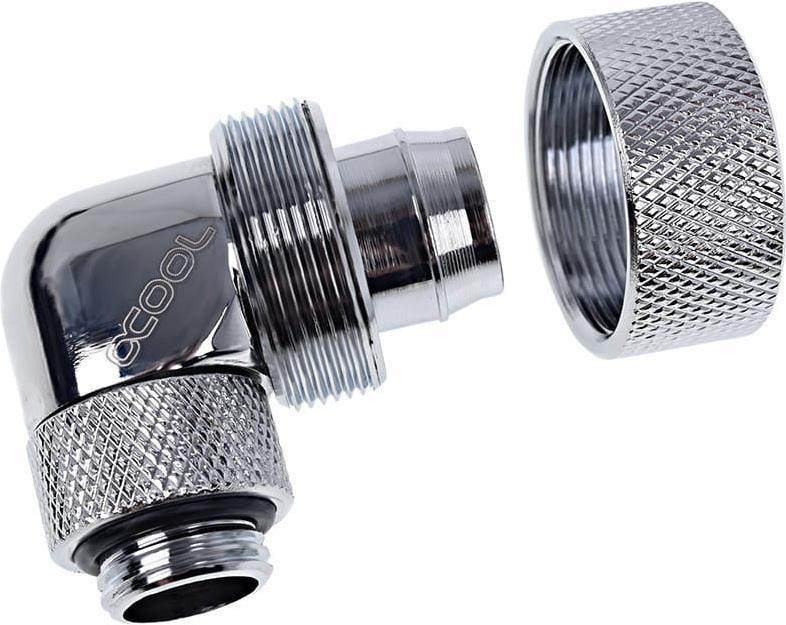 Dieser Anschluss hat auf der einen Seite ein 1/4\" Gewinde und ist so mit 95% aller Komponenten kompatibel. Die andere Seite ist passend für einen 19/13 mm Schlauch. In der Mitte ist dieser Anschluss um 90° gewinkelt um komplizierte Schlauchwege zu vermeiden. Für maximale Flexibilität ist die Seite mit dem Gewinde drehbar.Produkttext[/head]Alphacools Eiszapfen Anschlussserie ist die High End Ausführung der bewährten Anschlüsse!Alle Anforderungen die an einen Anschluss gestellt werden sind hier erfüllt: Highflow, Form, Verarbeitung und Farbgebung. Kompromisslosigkeit in Entwicklung und Herstellung haben die Eiszapfen zu dem gemacht was sie sind. In brillantem Chrome und mattem, tiefen schwarz sind zwei Ausführungen vorhanden die sich in jedes System hervorragend einfügen.Mit speziellen Verfahren werden die Beschichtungen fest mit dem Untergrund verbunden, die Langlebigkeit der intensiven Farben ist so gegeben und ein Abplatzen der Beschichtung wird unterbunden. Jeder Anschluss hat nun auch das Alphacool Logo was ihn neben seiner besonderen Form unverwechselbar macht!Durch die abgeschrägten Kanten der Überwurfmutter wird der O-Ring sehr fest an den HardTube angedrückt wodurch dieser noch fester als in den Vorgängern sitzt. Das sorgt für mehr Sicherheit bei Transporten.Ausführung: 90° Anschraubtülle 19/13mmDieser Anschluss hat auf der einen Seite ein 1/4\" Gewinde und ist so mit 95% aller Komponenten kompatibel. Die andere Seite ist passend für einen 19/13mm Schlauch. In der Mitte ist dieser Anschluss um 90° gewinkelt um komplizierte Schlauchwege zu vermeiden. Für maximale Flexibilität ist die Seite mit dem Gewinde[head]Hauptmerkmale