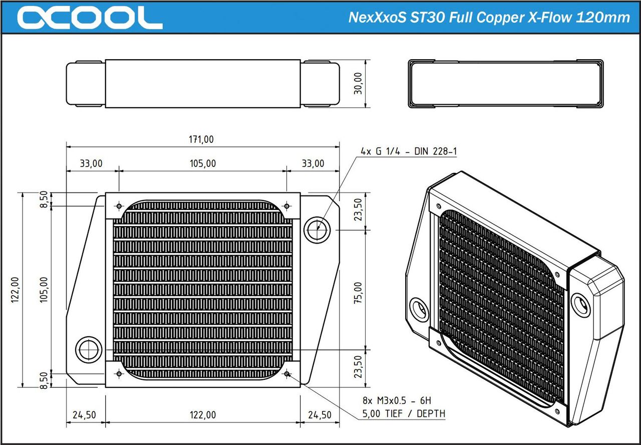 Die Alphacool NexXxos Radiatorengeneration, ein Name der für Erfahrung und Qualität steht, ist gekommen um Wind in den Radiatorenmarkt zu bringen!Jeder Nutzer einer Wasserkühlung benötigt einen Radiator und Jeder hat andere Ansprüche an den Wärmetauscher. Selbstverständlich will der Kunde stets den Besten seiner Klasse. Die Alphacool NexXxoS Radiatoren sind gekommen um den besten ihrer Klasse den Thron streitig zu machen, und in allen Bereichen und Größen der beste Radiator zu sein. Kein Hin und her mehr, Alphacools NexXoS Radiatoren, da weiß man was man hat! Alphacool ist seit Jahren in der Szene immer wieder ein Impulsgeber bei der Entwicklung und Verbesserung von Radiatoren. So sind diese Modelle mit die ersten Radiatoren, welche das Prädikat „Full Copper\" wirklich verdient haben! Alle Hauptelemente, nicht nur die Finnen und Kanäle, sondern auch die Vorkammern sind aus Kupfer. Dies bringt schon materialbedingt ein Leistungsplus, wo andere Radiatoren auf der Strecke bleiben. Beim Aufbau unterscheiden sich die Alphacool NexXxoS X-Flow Radiatoren schon maßgeblich von herkömmlichen Radiatoren. Die X-Flow Radiatoren sind für hohen Durchfluss konstruiert. Die abgeschrägten Kupferkammern auf beiden Seiten sind identisch aufgebaut. Dadurch wird das Wasser gleichzeitig durch alle vorhandenen Kanäle bis zur anderen Kammer gespült auf der es dann den Radiator verlässt.Freiraum bei der Montage ist einer der zentralen Punkte, auf welche sich die Entwicklungsabteilung bei Alphacool konzenztiert hat. An beiden Kupferkammern befinden sich je drei 1/4\" Gewinde. Jeweils nach oben, unten und nach vorne/hinten weg (nicht bei den NexXxoS ST30) können so Anschlüsse montiert werden. Weniger Winkel werden benötigt was wieder den Durchfluss steigert und mehr Möglichkeiten bei der Montage bietet.Auch hier stellt Alphacool die gängigen Größen der 120mm Serie bereit. Verschiedene Stärken, 30mm, 45mm und 60mm unterstreichen das breite Spektrum das diese Radiatoren abdecken.Auch die Montage des Radiators sowie von Lüftern und Radiatorblenden ist bei dieser Serie einfach zu bewerkstelligen: Die M3-Gewinde sind Standard im Radiatorensektor und günstig in allen Längen erhältlich.Selbst das gefürchtete zu tiefe Eindrehen der Montageschrauben führt bei diesem Radiator nicht zum teuren Schaden wie bei anderen Radiatoren: Eine innenliegende Schutzkante stoppt das Eindringen der Schraube bevor es zur Berührung mit den Finnen kommt.Der Finnenabstand wurde so gewählt, dass der Radiator optimale Kühlleistung bereits mit langsam und mittelschnell drehenden Lüftern erreicht. Dies ist nicht nur angenehm in Hinsicht auf Geräuschkulisse, sondern schränkt auch bei der Lüfterwahl nicht ein.Unterm Strich treffen hier Erfahrung und mächtige Performance auf Zukunftsorientierung und durchdachte Lösungen.