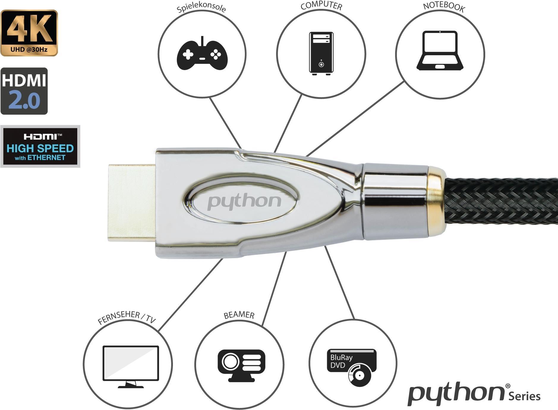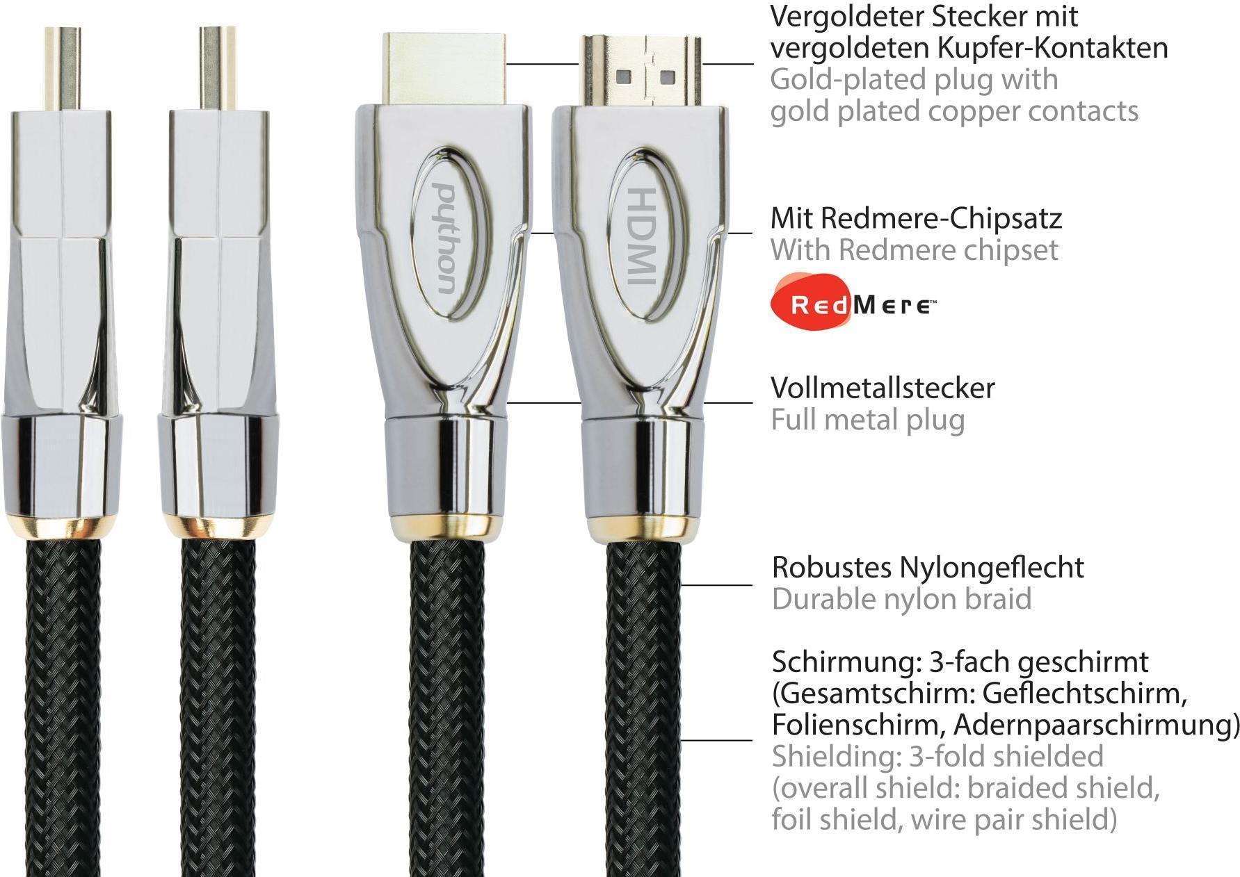 Anschlusskabel High-Speed-HDMI® mit Ethernet 4K2K / UHD, AKTIV (Redmere Chipsatz), vergoldete Kontakte, OFC, Nylongeflecht schwarz, 30 m, PYTHON® Seri