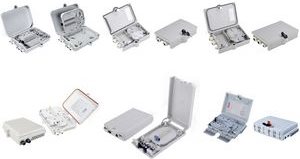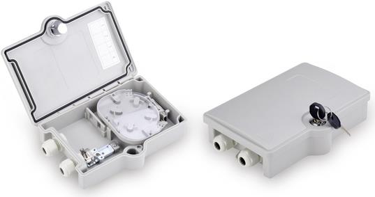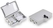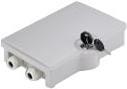 FTTH Distributions Box für außen, IP 65 für die Aufnahme von 2 SC simplex oder 2 LC Duplex Kupplungen und 4 Spleiße; Maße 215 x 150 x 50 mm