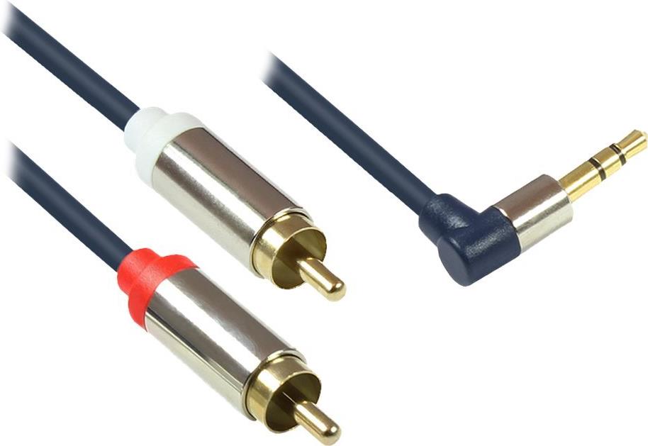 Audio Anschlusskabel High-Quality 3,5mm, Klinkenstecker rechts abgew. an 2x RCA Stecker, Vollmetallgehäuse, dunkelblau, 1m, Good Connections (GC-M0063)