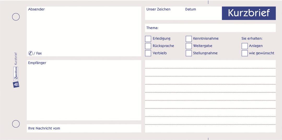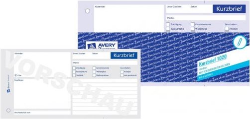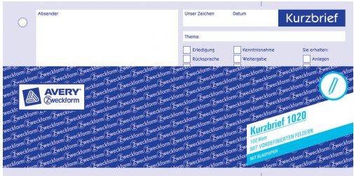Nie mehr etwas vergessen - mit dem Kurzbrief von Avery Zweckform. Der Kurzbrief enthält bereits die wichtigsten Punkte zum Ankreuzen, z.B. zur Erledigung, Rücksprache, Stellungnahme, etc. Der Kurzbrief im 1/3 DIN A4 Format ist mit 1 Blatt Blaupapier ausgestattet.