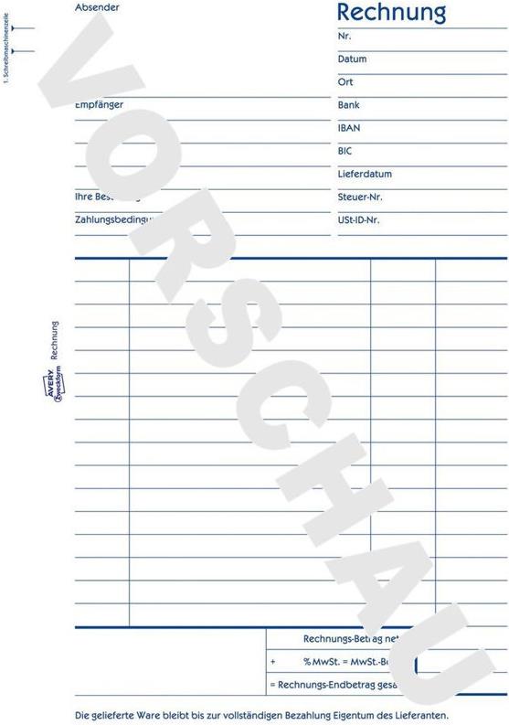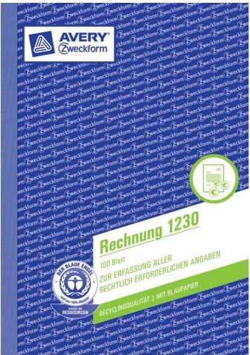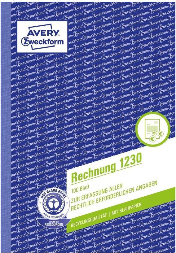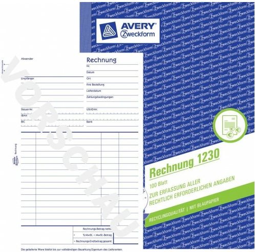Die Rechnungen von Avery Zweckform enthalten alle wichtigen Angaben wie Steuernummer, Umsatzsteuer Identifikationsnummer, Bankverbindung sowie Angaben zu Artikeln und Preisen. Damit stellen Sie die steuerliche Anerkennung sicher. Die Rechnung im DIN A5 Format beinhaltet 100 mikroperforierte Originale mit 1 Blatt Blaupapier und ist aus Recyclingpapier hergestellt.