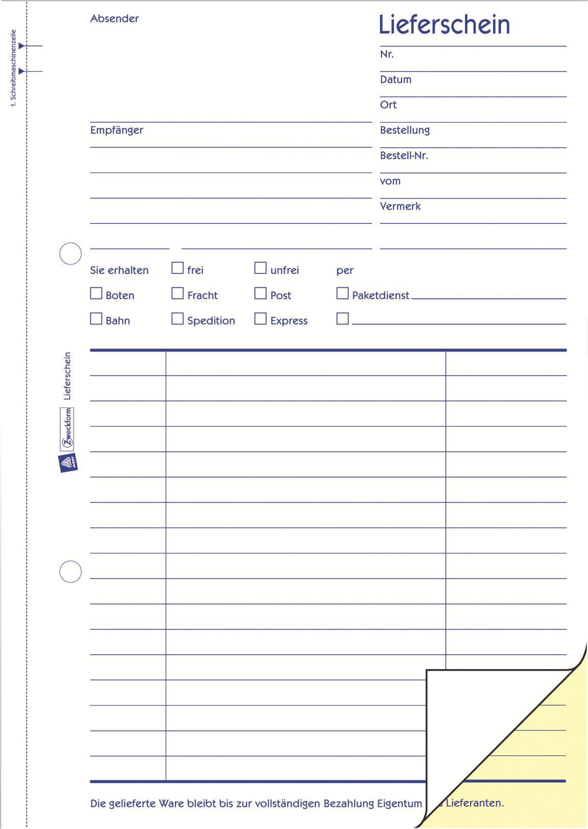 Die Lieferscheine von Avery Zweckform helfen Ihnen dabei zu dokumentieren welche Produkte bzw. Waren Sie geliefert oder empfangen haben. Die Liefer-/ Versandart ist bereits auf dem selbstdurchschreibenden Lieferschein im DIN A5 Format vorgegeben und kann angekreuzt werden.