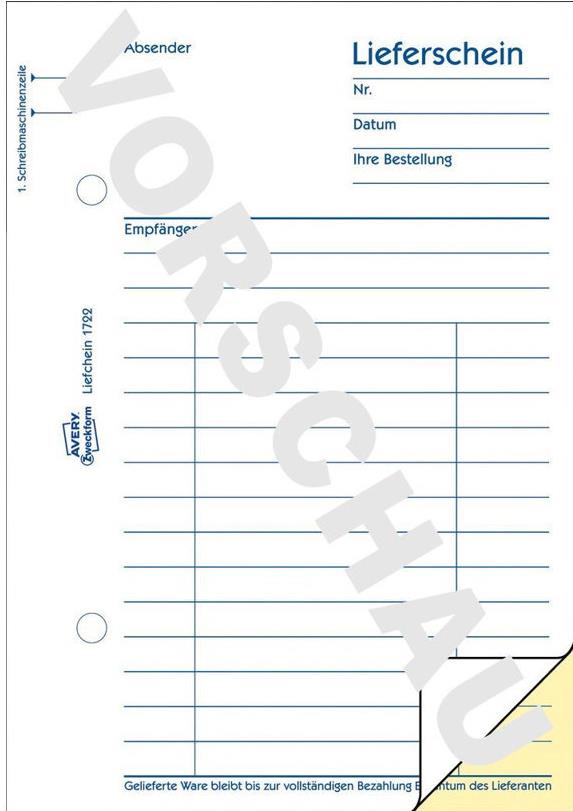 Die Lieferscheine von Avery Zweckform helfen Ihnen dabei zu dokumentieren welche Produkte bzw. Waren Sie geliefert oder empfangen haben. Die Liefer-/ Versandart ist bereits auf dem selbstdurchschreibenden Lieferschein im DIN A6 Format vorgegeben und kann angekreuzt werden.