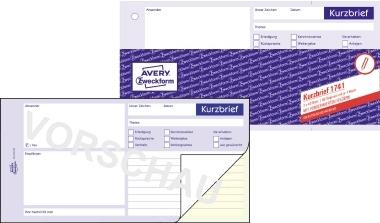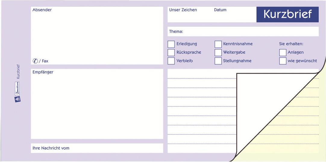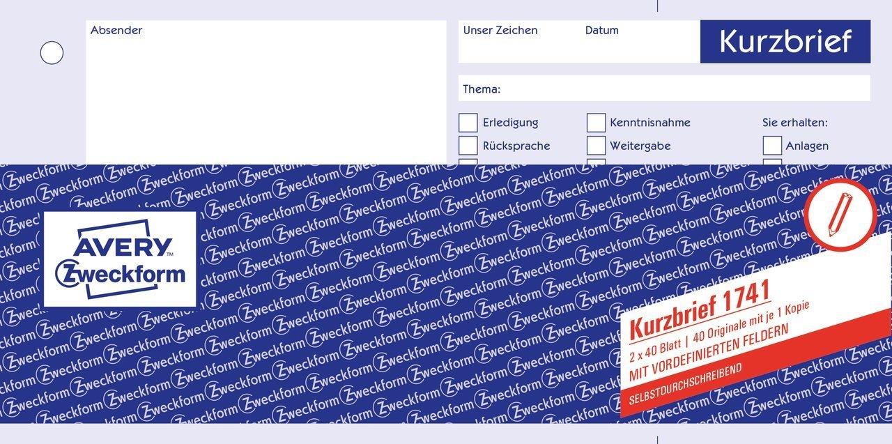 Nie mehr etwas vergessen - mit dem Kurzbrief von Avery Zweckform. Der Kurzbrief enthält bereits die wichtigsten Punkte zum Ankreuzen, z.B. zur Erledigung, Rücksprache, Stellungnahme, etc. Der selbstdurchschreibende Kurzbrief im 1/3 DIN A4 Format hat einen gelben Durchschlag und ist mit 1 Blatt Blaupapier ausgestattet.