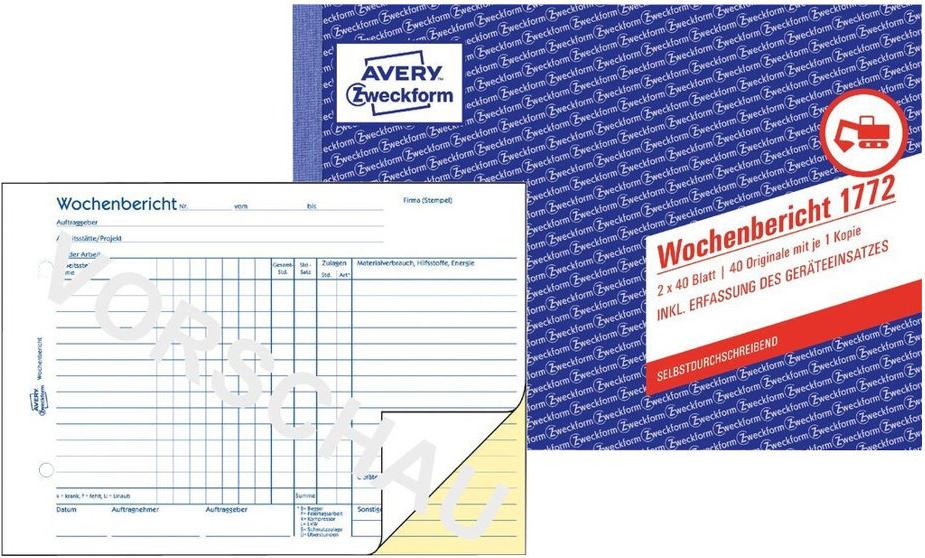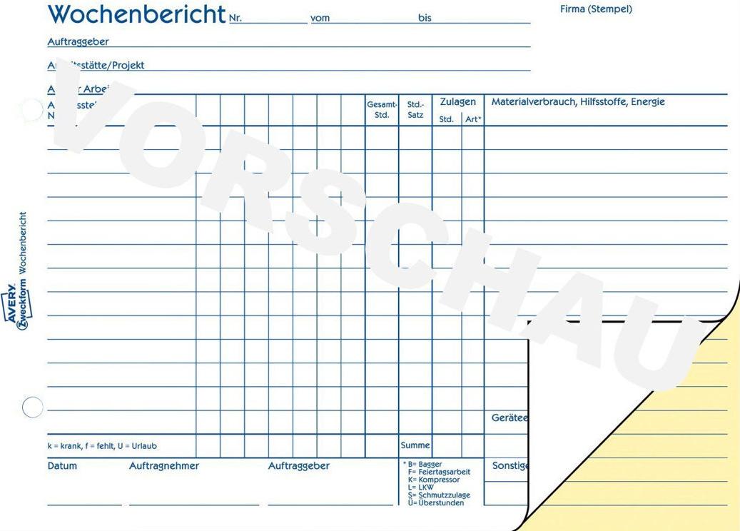 Die Bauformulare von Avery Zweckform sind unverzichtbare Helfer für Bau und Handwerk. Der Wochenbericht eignet sich besonders, um die wöchentliche Arbeitsleistung und den Materialverbrauch zu dokumentieren. Der Wochenbericht im DIN A5 Querformat beinhaltet einen gelben Durchschlag und ist selbstdurchschreibend. Die Bauformulare von Avery Zweckform sind vorgelocht, für eine schnelle Ablage!